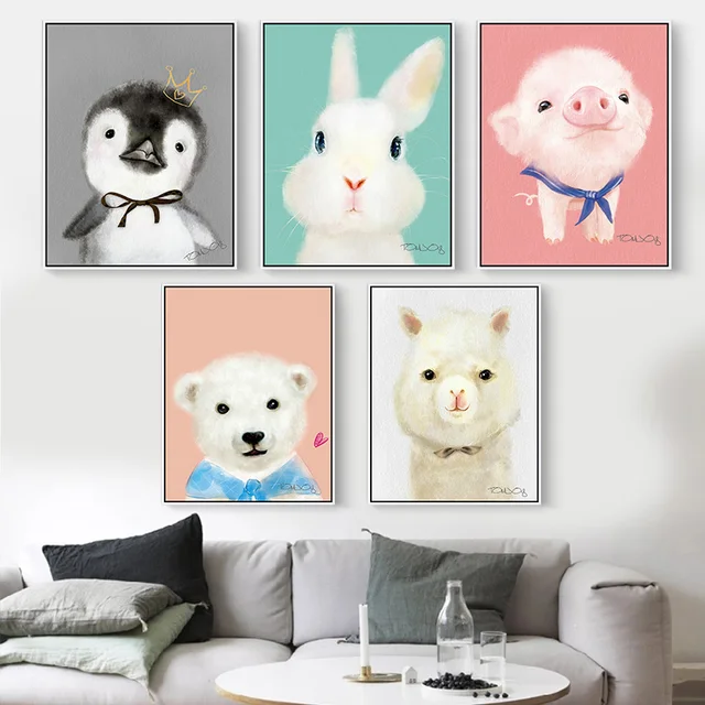 Modern Kartun Lucu Hewan Kelinci Babi Anjing Canvas Art Print