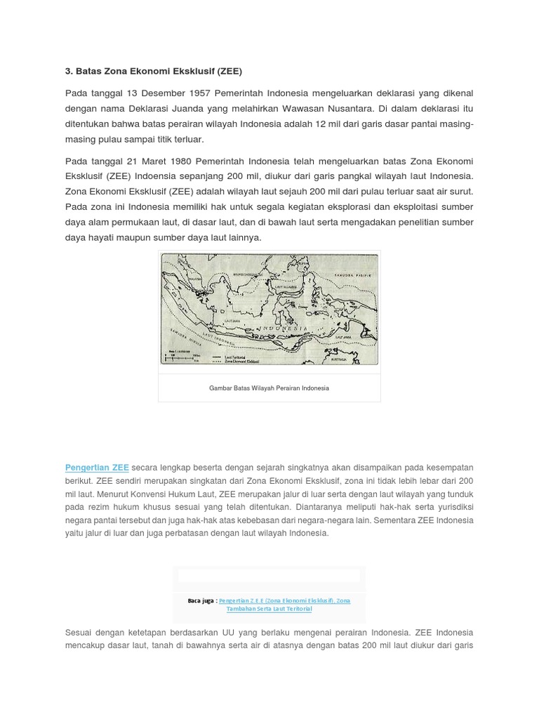 Sejauh 12 mil laut di luar batas laut teritorial atau 24 mil dari pantai adalah batas zona bersebelahan. Berdasarkan kesepakatan tersebut wilayah perairan indonesia meliputi batas laut teritorial batas landas kontinen dan batas zona ekonomi eksklusif. Kemudian secara geografis batas wilayah indonesia meliputi.