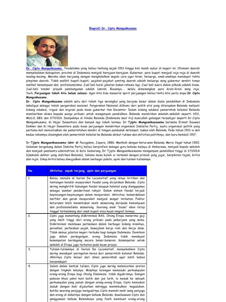 Ia adalah putera tertua dari mangunkusumo seorang priyayi rendahan dalam struktur masyarakat jawa. Cipto mangunkusumo pecangaan jepara jawa tengah 1886 jakarta 8 maret 1943 adalah seorang tokoh pergerakan kemerdekaan indonesiabersama dengan ernest douwes dekker dan ki hajar dewantara ia dikenal sebagai tiga serangkai yang banyak menyebarluaskan ide pemerintahan sendiri dan kritis terhadap pemerintahan penjajahan hindia belanda. Biografi tjipto mangunkusumo dr.